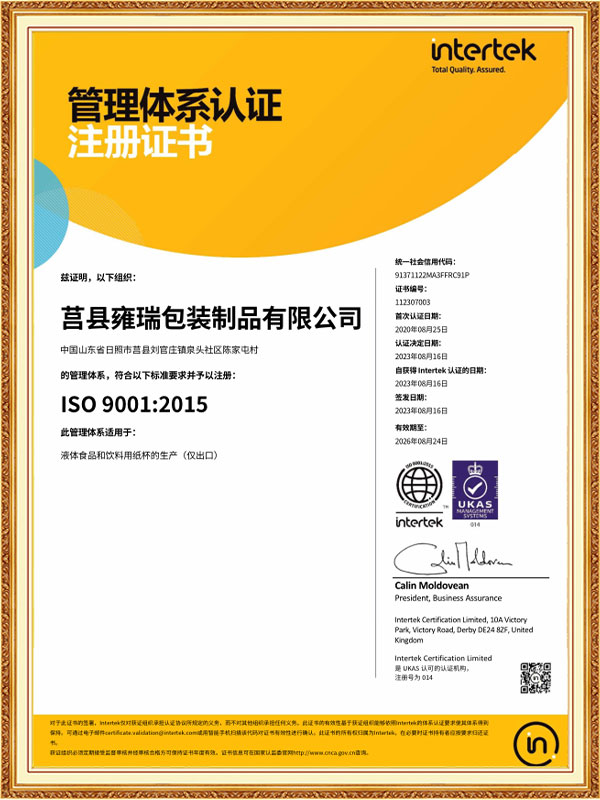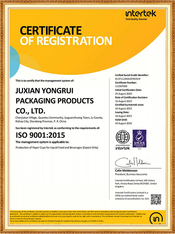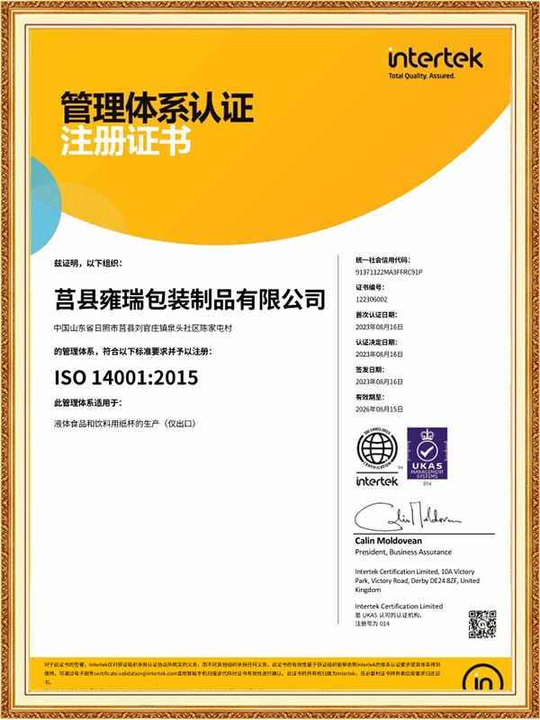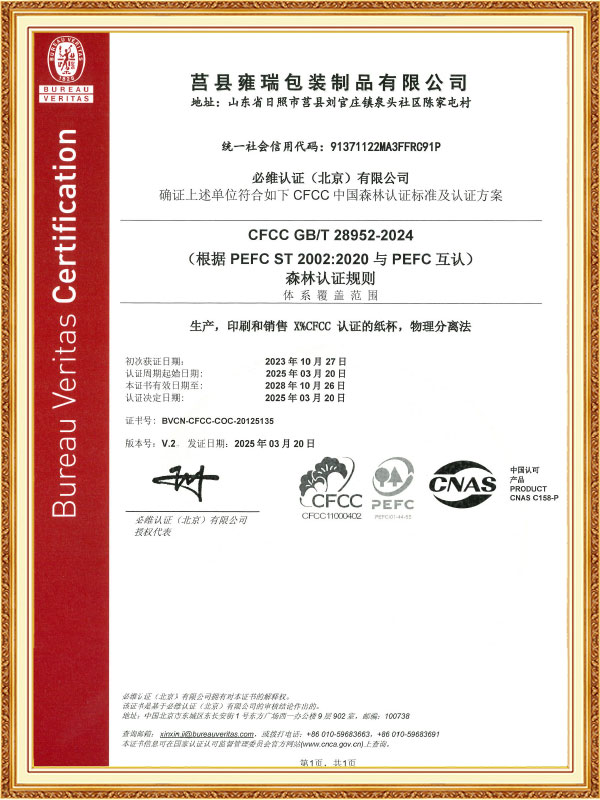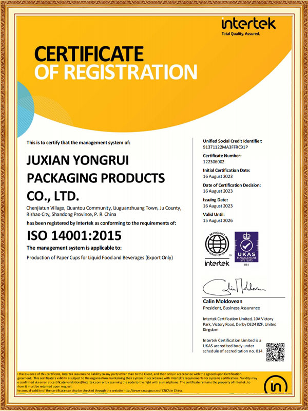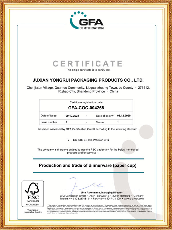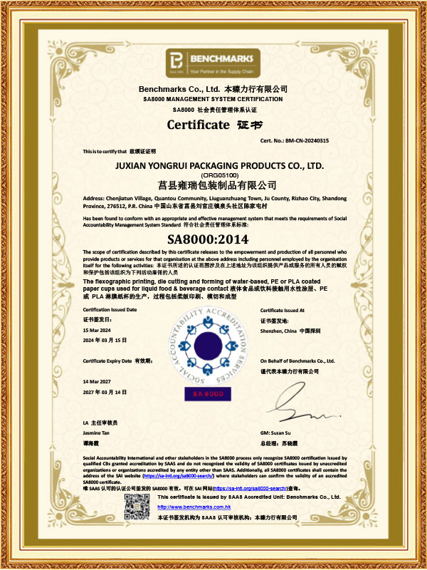 একা স্থায়িত্ব যথেষ্ট নয় - স্থায়িত্বও একটি অগ্রাধিকার। Juxian Yongrui এর পণ্যের অধীনে প্রত্যয়িত হয় ISO 9001, ISO 14001, FSC, BRC, এবং DIN , আন্তর্জাতিক গুণমান এবং পরিবেশগত মানগুলির সাথে সম্মতি নিশ্চিত করা। FSC- এবং EUDR- সম্মত কাঁচামাল ব্যবহার করে, কোম্পানি সক্রিয়ভাবে পরিবেশগত প্রভাব হ্রাস করছে এবং এমন পণ্য সরবরাহ করছে যা নিরাপদে গলে না গিয়ে গরম খাবার পরিচালনা করতে পারে।